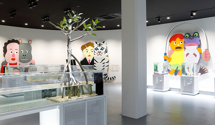 会場は、全国巡回展覧会「tupera tupera のかおてん.」でクリエイティブを担当したデザインチームminnaが、グラフィックから空間デザインまでを手掛け、ニフレルの館内各所に生きものと作品と来館者をつなぐ愉快な仕掛けに。