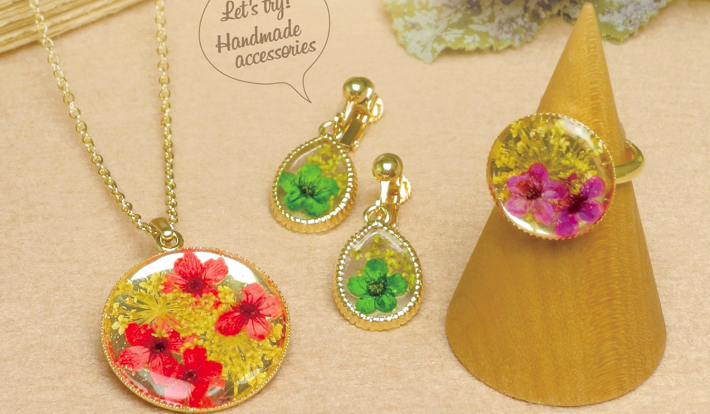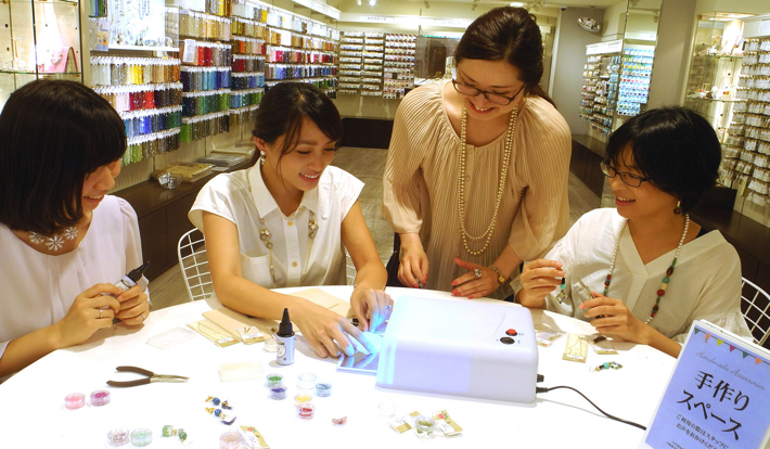 簡単なアクセサリーなら店内のテーブルでの作成が可能。店内のパーツをワクワクしながら選び、通して作る。作る楽しみの後は、身に着けるワクワク感を味わうことができる。店内で作られる場合は、必要な工具を無料で貸し出す。店内には無料のレシピを多数設置し、自由に持ち帰ることができる。