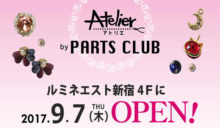 ビーズ&アクセサリーショップ「PARTS CLUB(パーツクラブ)」は、店内でオリジナルアクセサリー作りも楽しめる新ショップ「ATELIER by PARTS CLUB(アトリエ バイ パーツクラブ)」を、ルミネエスト新宿店4階に2017年9月7日(木)にオープンした。
