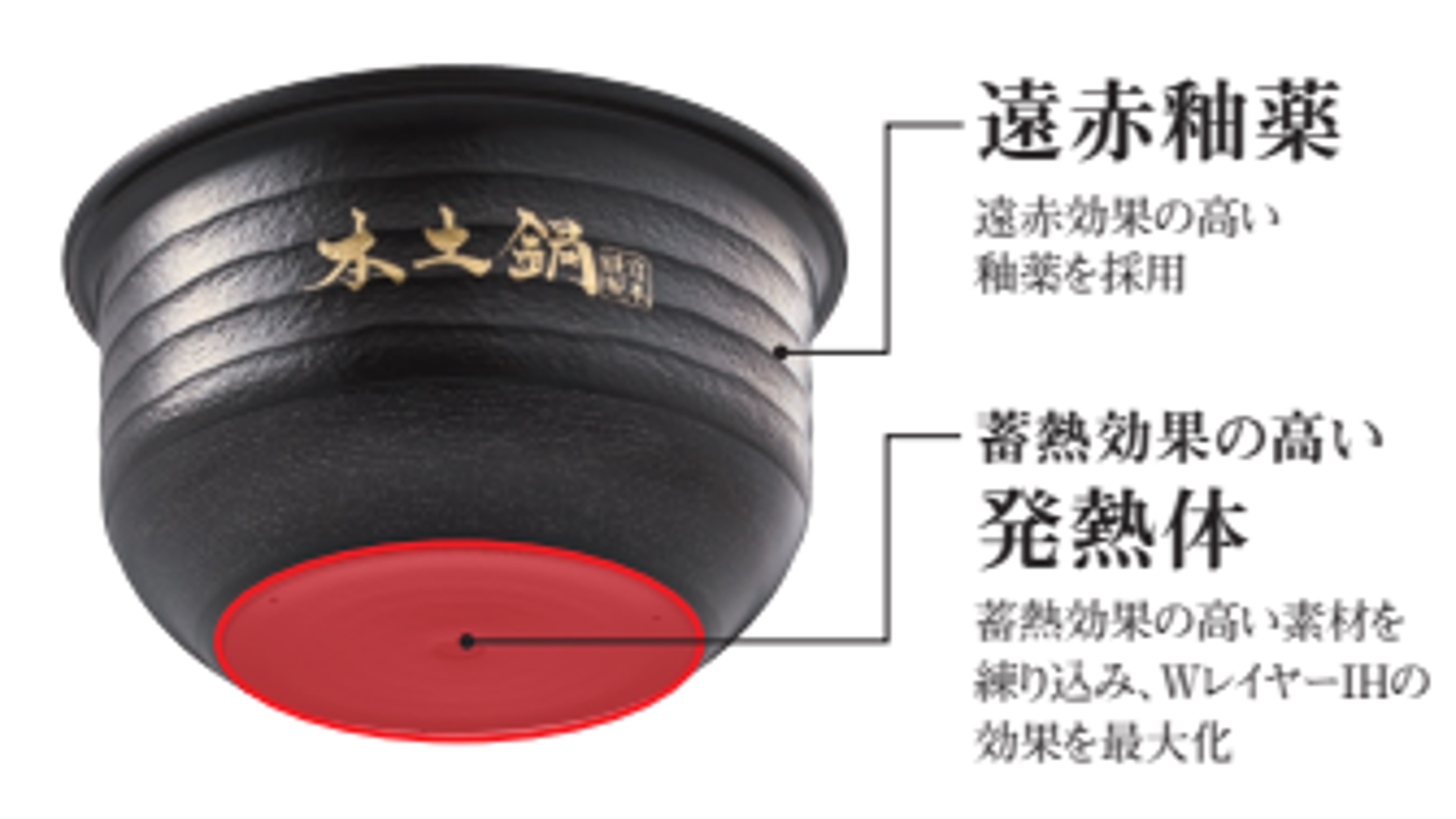 ▼「土鍋」“遠赤釉薬”と“火山灰を練り込んだIH発熱体”により、300℃ WレイヤーIH※1が進化