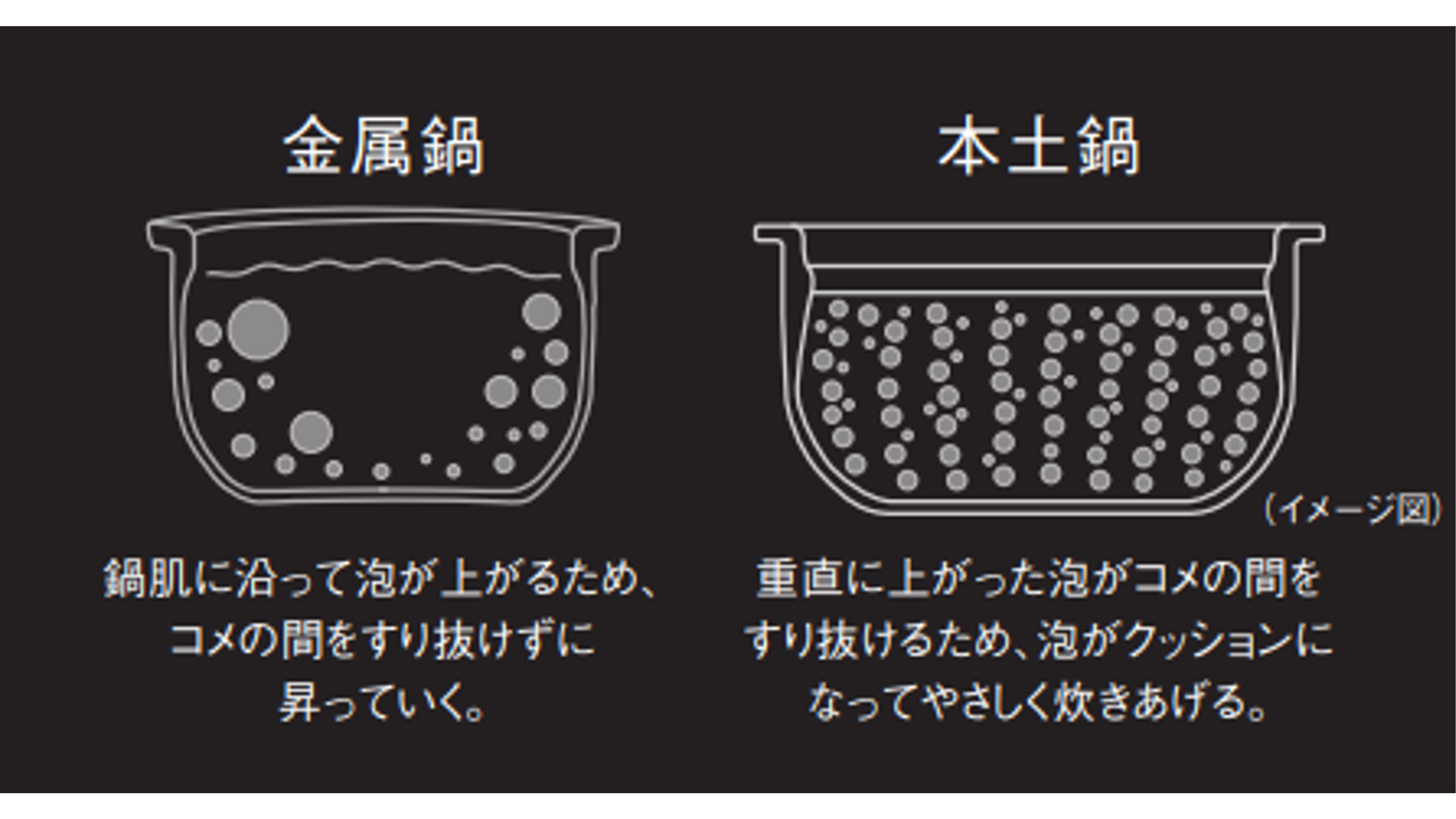 激しい対流の中ではお米の表面が傷いて、べたついた食感になったり、傷ついたお米の表皮からデンプンが流れ出て、ごはんの旨みが低減される原因になるが、「ご泡火炊き」では、土鍋の表面から生み出される、土鍋ならではの細かくやさしい泡立ちでごはんを炊きあげる。