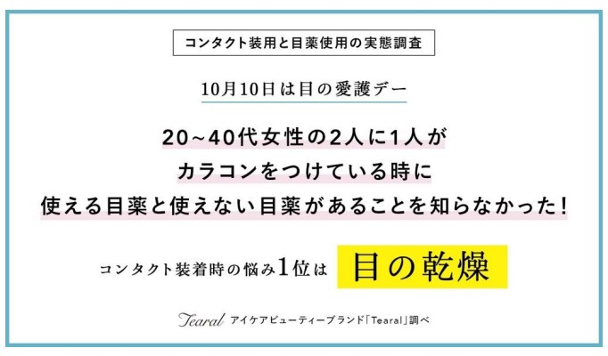 株式会社I−ne (本社:⼤阪市中央区) が展開するアイケアビューティーブランド「Tearal(ティアラル)」は、「⽬の愛護デー (10 ⽉ 10 ⽇)」に向けて、20~40 代の 316 名に対して、コンタクト着⽤と⽬薬使⽤の実態調査を実施した。