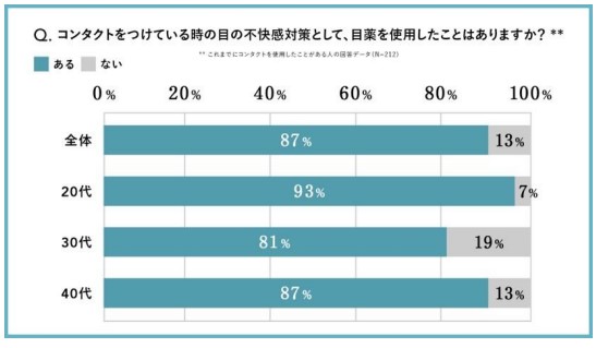 「コンタクトをつけている時の⽬の不快感対策として、⽬薬を使⽤したことはありますか? 」という問いに対し、87%が「ある」と回答。年代別に⾒ると、20 代⼥性が⼀番多く93%、次いで 40 代⼥性が 87%、30 代⼥性が 81%という結果となった。