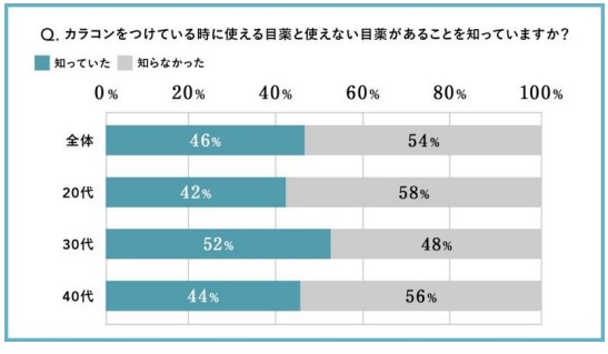 「カラコンをつけている時に使える⽬薬と使えない⽬薬があることを知っていますか? 」という問いに対し、54%が「知らなかった」と回答。年代別に⾒ると、20 代⼥性が⼀番多く58%、次いで 40 代⼥性が 56%、30 代⼥性が 48%という結果になった。
