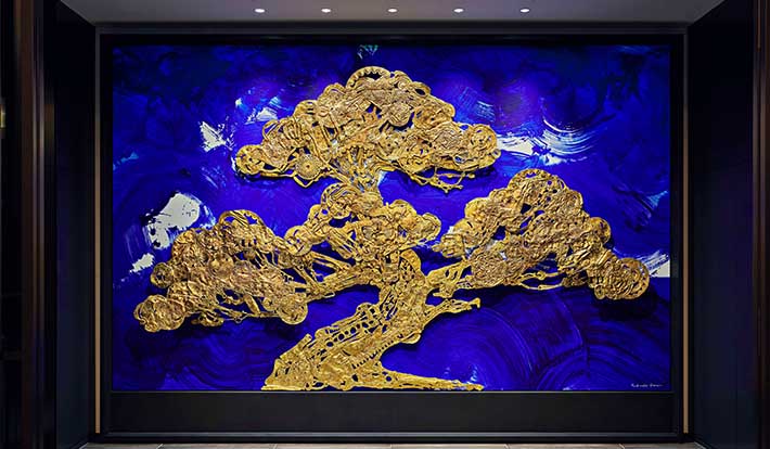 左)ハイアット セントリック 金沢のロビーに配された⾦箔のアート作品。右)⾦箔貼りイメージ ※写真提供:箔一