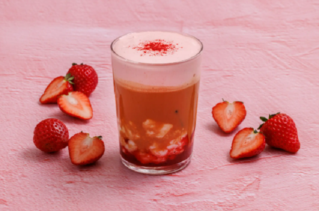 芳醇な香港ミルクティーに、自家製杏仁豆腐と甘酸っぱいいちごソースをプラス。さらに、ふわふわのストロベリーフォームとラズベリーパウダーをトッピングし、華やかな味わい。濃厚なコクと爽やかな甘酸っぱさが絶妙に調和し、春の訪れを感じる、スイーツ感覚の贅沢な一杯。