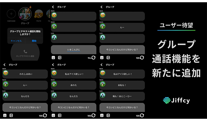 アプリ開発を手掛けている穴熊は同社が提供するテキスト通話アプリ『Jiffcy(ジフシー)』のサービスアップデートを発表した。19日より新たにグループ通話機能を追加し、これまで1対1に限られていたテキスト通話を最大4人のグループで利用できるようになる。