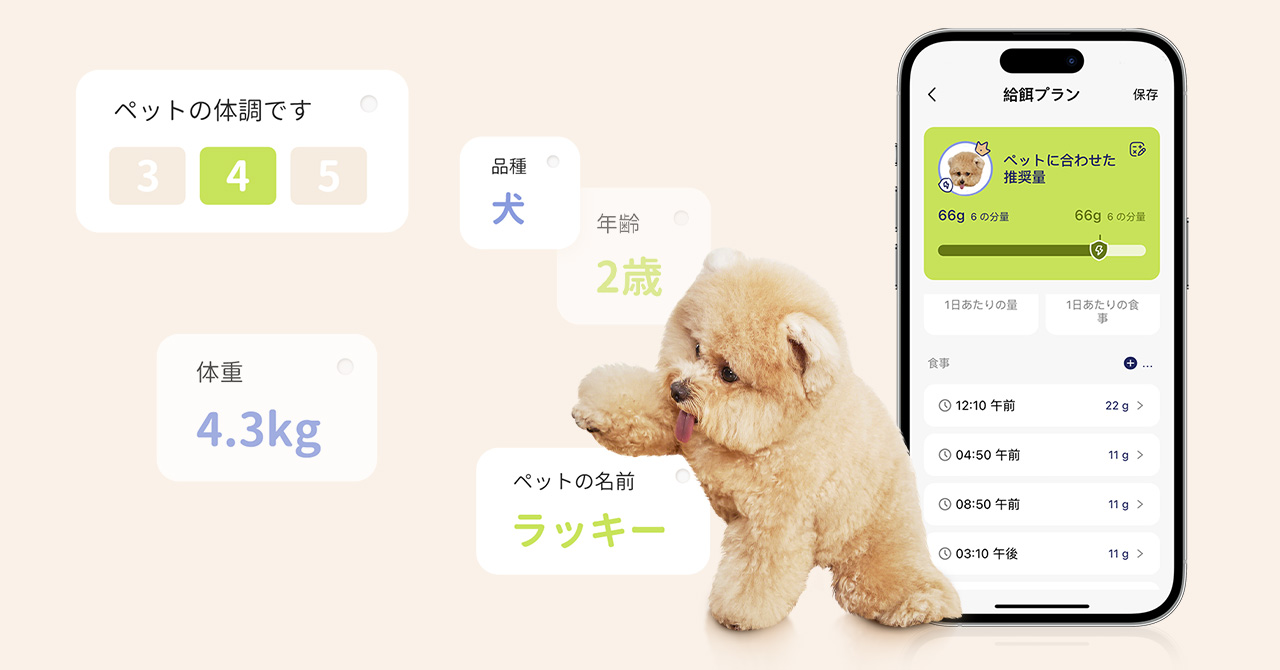 現在、日本のペットの約50%(*)が肥満傾向にあるとされ、適切な食事管理が求められています。しかし、飼い主の多くは「どれくらいの量を与えるべきか分からない」と悩んでおり、結果的に食べ過ぎや食べ足りなさが発生しています。また、食事のタイミングが不規則だと、ペットが一度の食事で過剰に食べてしまうこともあります。