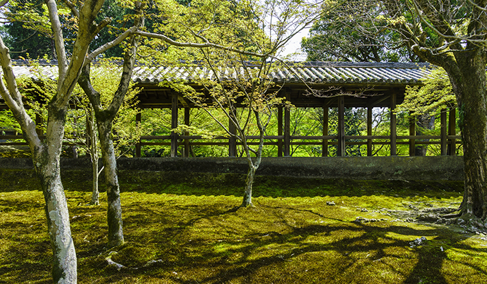写真左)通天橋の周辺庭園。通天橋周辺に広がる庭園は、構成美をもつ方丈庭園とは対照的に、自然の起伏と植栽の流れによって生み出された景観美を形づくっている。