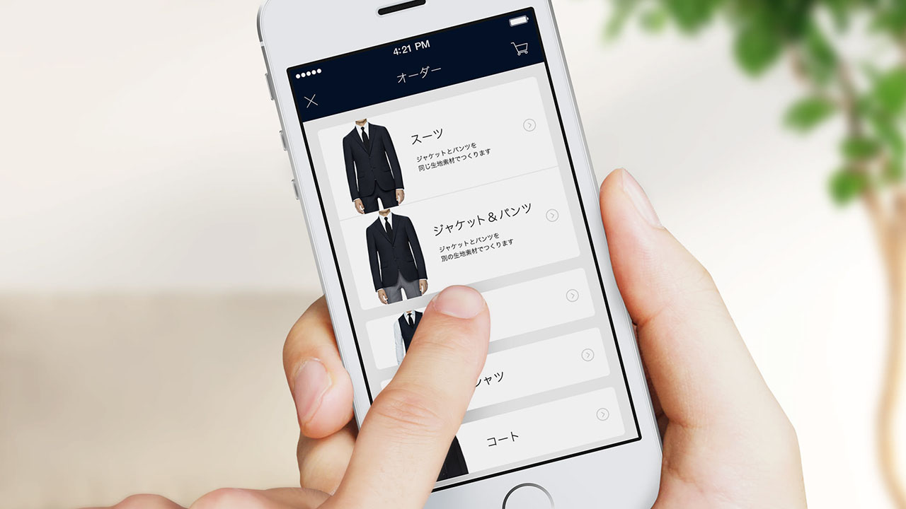 オーダースーツブランド「DIFFERENCE」は、初回ショップでプロのテイラーによる採寸を行い、データをもとに二着目以降お客様自らがスマホアプリを操作して様々なカスタマイズや注文を可能にした、コナカの新発想オーダースーツブランドである。
