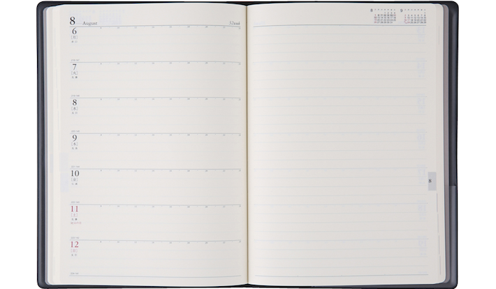 特徴|メモスペースがたっぷり付いた自由度の高い大型のバーティカル式ダイアリー。高級感のあるステッチ入りカバー。