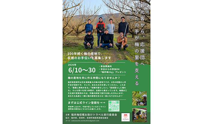 梅の収穫時期に人手が不足しがちな6月、福井県若狭町で農作業ボランティアと旅を組み合わせた取り組み「福井梅収穫お助けトラベル(通称:福井梅おたベル)」が今年も開催される。受入期間は2026年6月10日(水)〜30日(火)で、参加者の申し込みを受け付けている。