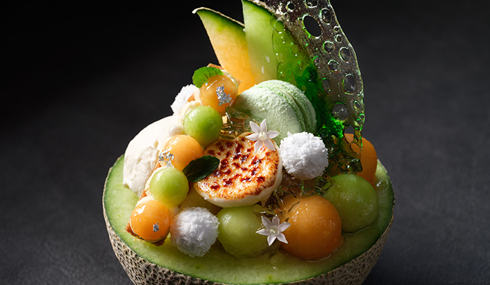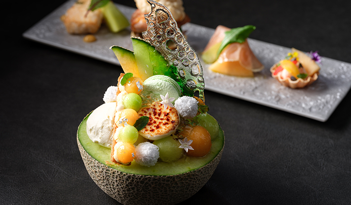 みずみずしく芳醇なハーフサイズの果実を器に見立て、ホテルメイドのメロンスイーツを立体的にあしらい、視覚・味覚・食感のすべてで堪能できる、至福のメロンボウル。初夏らしい爽やかなグリーンをベースに、軽やかな口どけのショートケーキ、繊細な層が重なるミルフィーユなど、メロンの個性を多彩なスタイルで表現している。さらに、河北潟牛乳のブランマンジェ、トンカ豆が香るバニラアイスクリーム、マスカルポーネシブースト、ジャスミンチーズケーキといったフルーツの甘みをより一層引き立てる品々が揃う。