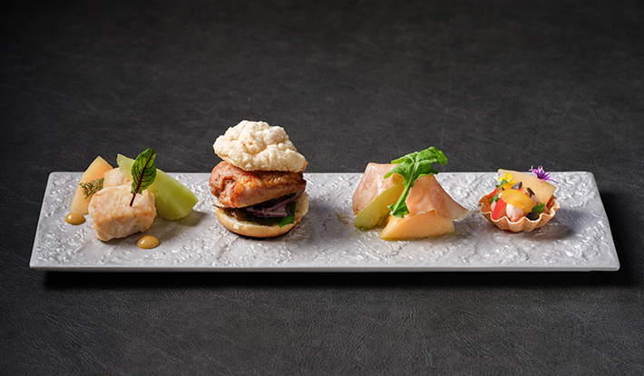 また、セイボリーには王道の生ハム&メロンをはじめ、爽快感が広がる赤肉メロンのセビーチェ、金沢の「ノトヒバカラベーカリー」特製メロンパンにスパイシーチキンを挟んだバーガーなどをラインアップ。