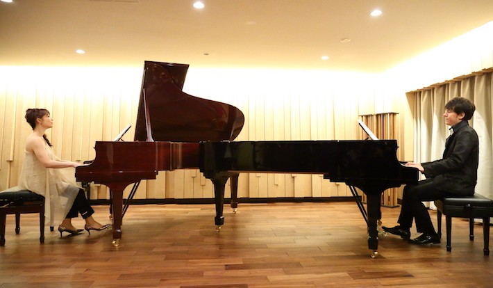 第1会場の「STEINWAY & SONS TOKYO」では、重厚感のある隠し扉が開くと、ゲストは「ピアノ・ルーム」へと案内され、序盤、ピアニストの金子三勇士氏と新井由佳梨氏がスタインウェイによる美しい演奏を披露した。
