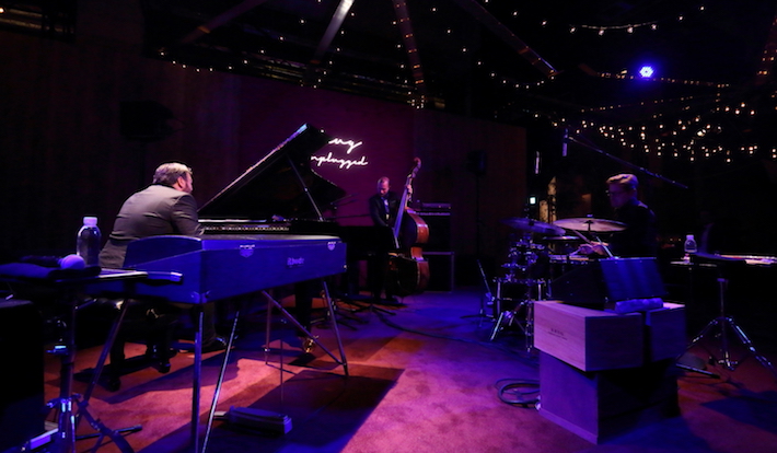 続いて、第2の会場とエスコートされたゲストが「森」をイメージしたディナー会場の席に着くと、エリック・レニーニ・トリオによるジャズの演奏が開始され、120種類以上のワインをアッサンブラージュして作りあげる『クリュッグ グランド・キュヴェ』の多様性や複雑で力強い個性を、ピアノ、パーカッション、チェロのアンサンブルにより繊細かつ情熱的に表現。