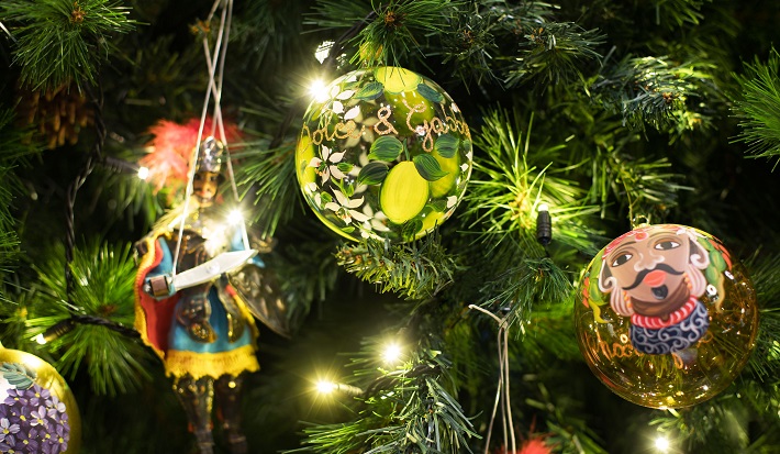吹きガラスのオーナメントには、レモンやオレンジ、サボテン、ムーア⼈の顔などのさまざまなモチーフが描かれ、多くのシチリアンパペットが飾られている。