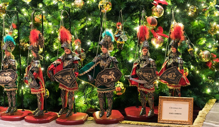 ⼈形劇に登場する騎⼠や貴婦⼈、飾り⾺⾞など、ドルチェ&ガッバーナのコレクションにも登場するアイコンも飾られ、故郷シチリアの情景とともに、ブランドの気品に満ちたスタイルが表現されている。
