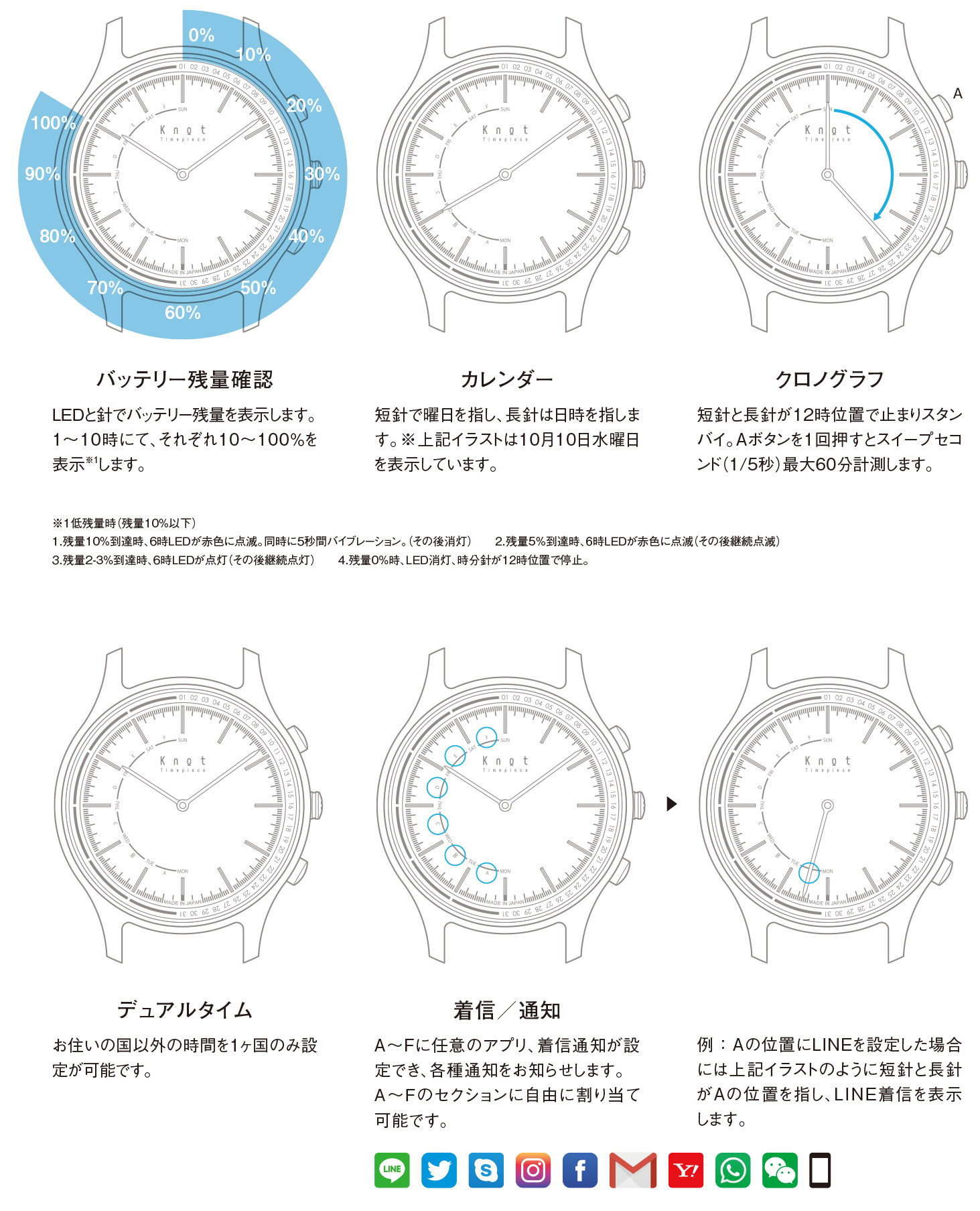 特筆すべきは、どのアプリからメッセージが届いたのか、針位置で知らせてくれる機能だろう。6時から12時位置のインデックス間を6つに分け、AからFまで割り振られている。これにより、LINEやmessenger、Instagramなど、どのアプリで着信したのかが一目瞭然。