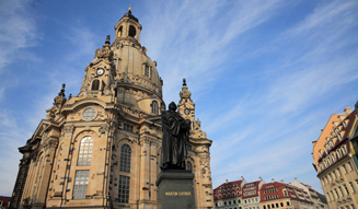 第2次大戦中、連合国軍によって空爆された聖母教会(フラウエン教会)は、瓦礫と化した建材を可能な限り元の位置に戻す作業を繰り返し2005年に復建。ふたたびドレスデンのシンボルとして街を見守っている。