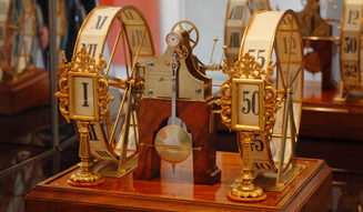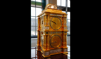数学・物理サロンが保有する収蔵品のなかでも、エバーハルト・バルデヴァイン(1525-1593)の天文時計は最も貴重なのもの。1563年から1568年にかけて製作され、ケースは真鍮製で表面に金メッキと銀メッキの処理が施されている。世界の中心を地球とする、つまり天動説に由来する作品だが、当時すでに知られていた7つの惑星が地球の周りを回る。