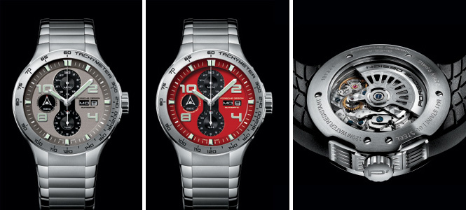 ムーブメントは旧バルジュー社が開発し、現在はETAが製造するCal.7750を搭載。メカの信頼性には定評があるうえ、独自の仕上げを施してリファインし、クロノメーター検定をパスしている。単純にクロノグラフとしてみても一級品であり、これにデザイン的要素が絡み、モータースポーツ・クロノグラフに相応しい出来映えを誇る。ほかのモデルと同様、文字盤カラーはブラック、チタン、レッドの3色があり、好みのものを選択可能だ。「フラットシックス P’6340 オートマティック」と同様、ポルシェファンなら、ぜひ入手したい一本である。