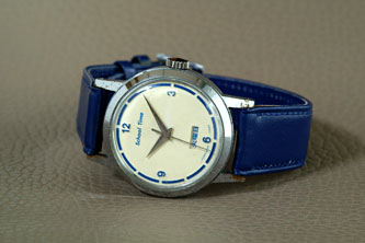 それが青いストラップの付いたモデルです。長尾善夫さんの著書『国産腕時計 (7) セイコーマーベル』(トンボ出版刊)によれば、これは「スクールタイム・ウィークデータ」というモデルで、1964年に発売されたものだそうです。
