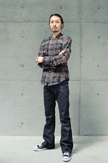 フレアのジーンズに、スタンドカラーのシャツのボタンを上まで閉めてキレイなカジュアルで着ています。シャツはコットンガーゼ素材で着心地が良く、デニムも今回はとてもクロムハーツらしいこだわりの新作なので、自分らしく着こなせますね。