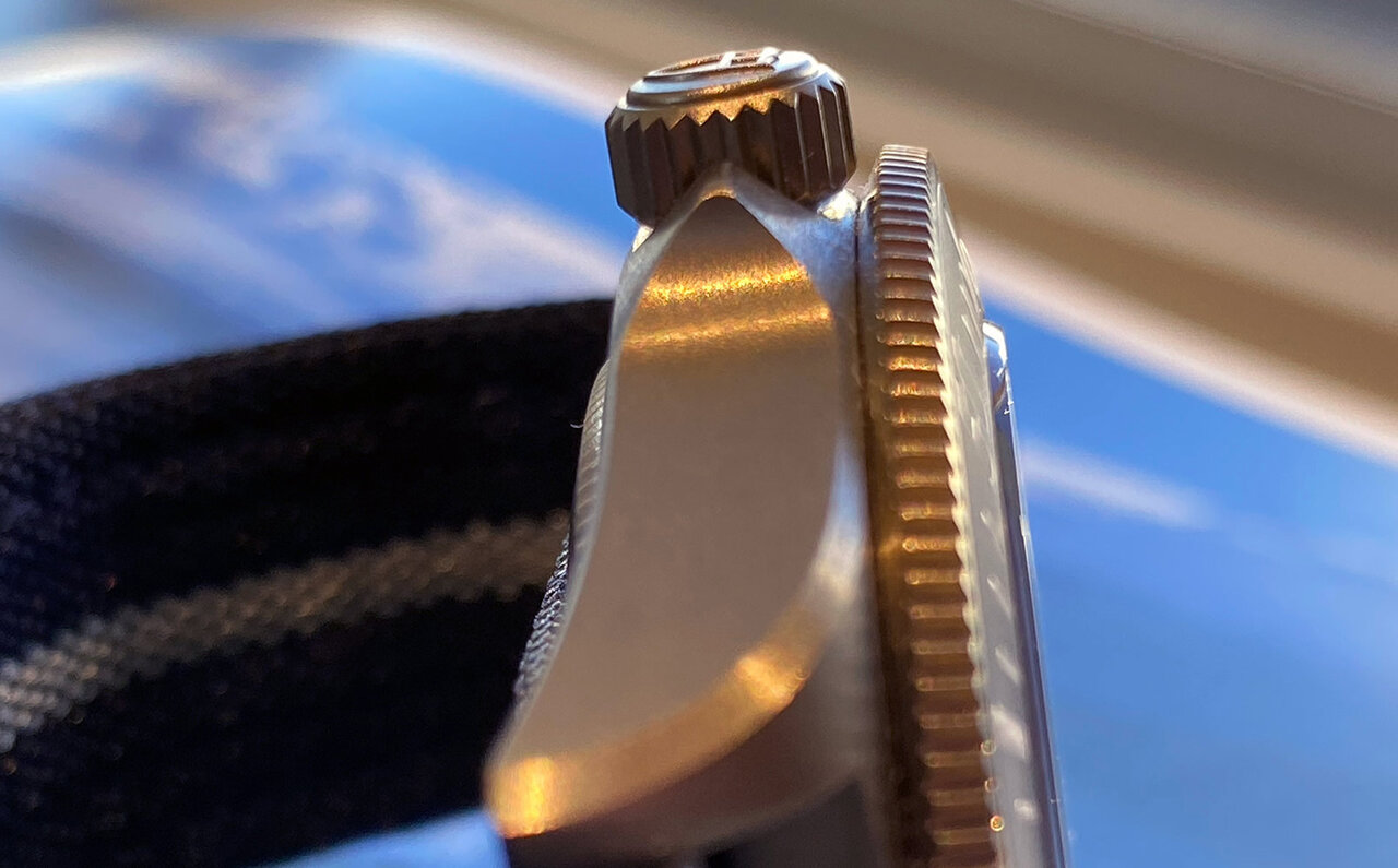 フランス海軍の刻印“M.N.のイニシャルと製造年”があるバックケース。このエピソードは、先のリンク記事を参照してください。この画像で見てほしいのが、ケース脇に若干はみ出ているベゼルの太さ。両回転ベゼルを操作しやすいようにベゼル枠が太いのです。第一印象が強めに見えるのは、このベゼルの太さにあること、気づいてました?