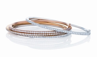 このほかにも繊細なデザインとそれぞれのカラーが織り成す個性的な輝きが印象的な「スレッドパヴェ」コレクションからも新作の「ハーフ オーバル バングル」と「フープ イヤリング」が登場。「ハーフ オーバル バングル」は52個のダイヤモンドがセッティングされ、クラシックなオーバル型は、昼と夜のどんな装いにもエレガントにマッチする。