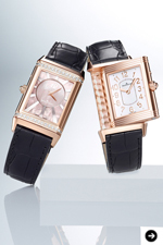 伝統の二重反転式レクタンギュラーケースのなかに、ひとつのムーブメントながら表と裏で時間帯のことなる時刻を表示できる、デュアルタイムウォッチの名品「レベルソ・デュオ」。日本でもっとも人気の高いこのモデルに、待望のウルトラスリムケースがついに登場した。過去のデザインを引用した文字盤を採用することで、従来よりもクラシックなテイストに仕上がっている。写真のPGケースのほかにSSケース、そしてジャガー・ルクルトのブティックのみで購入可能なSSケースの限定モデルも用意される。また、ひと回り小さいケースサイズで登場したダイヤモンド付きケースのレディスモデル「グランド・レベルソ・レディ・ウルトラスリム・デュエット・デュオ」もある。