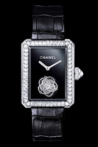 角型ケースに収められたカメリアモチーフの手巻き、225個のパーツから構成されるフライングトゥールビヨンムーブメントは、キャリバー“プルミエール フライング トゥールビヨン”。ムーブメント開発は、スイス随一のコンプリケーション開発工房であるルノー・エ・パピAPRP社との協力により、シャネル専用として開発されたもの。重力による時間精度の劣化を最小限に抑えながら美しく時を刻む。