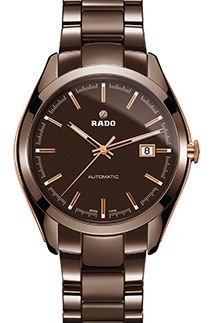 ハイテクセラミックスには、ラドーが得意とする技術があり、専用の高温炉でケースを焼成して、初めて生まれたものだ。ブラウンに発色したモノブロック構造のケースやブラウンのパーツを繋ぎ合わせたブレスレットは、ポリッシュもしくはサテンに仕上げられ、時計の表面に微妙な明暗を生み、美しい立体感を生み出している。