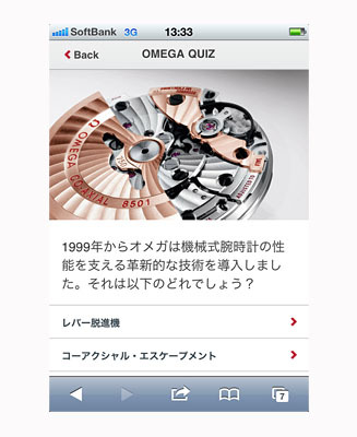 「スペシャルコンテンツ」ページでは、日本入荷商品や各種イベントなどの最新ニュース情報をはじめ、オメガにまつわるクイズなどもあり。また、モバイル会員登録すると、待ち受け画像をダウンロードできるなど、さまざまな特典サービスも受けられる。会員向けのイベントご招待など、充実したコンテンツの更新を予定している。