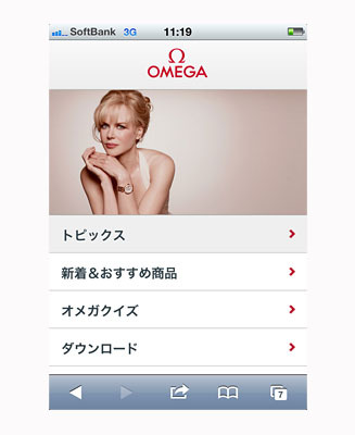 OMEGAのオフィシャルウェブサイトが、スマートフォン・ケータイでも閲覧できるようになった。PCサイトと同様のアドレスで、スマートフォン・携帯電話各種からアクセスすると、自動判別でモバイルサイトにいくことができる。
