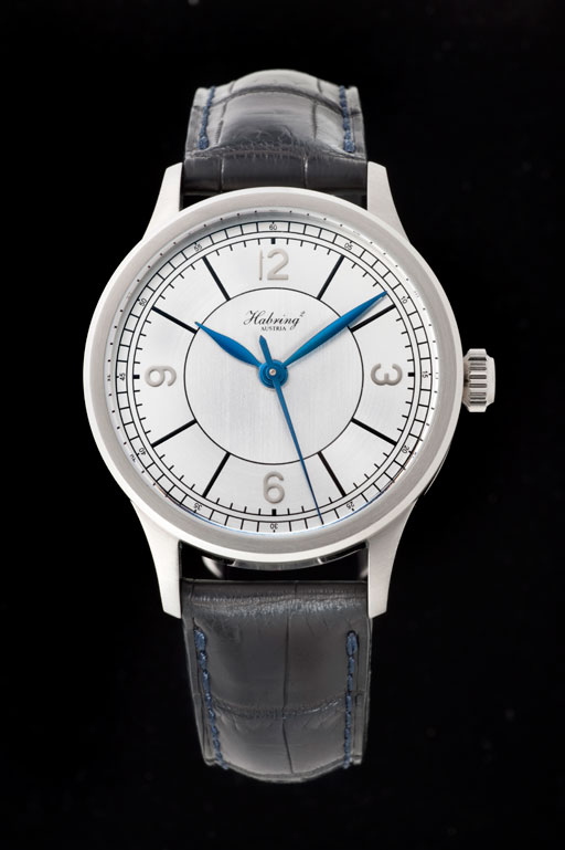ハブリング2のリチャード・ハブリング氏がこだわったのは、全体のデザインバランスとサイズ感。1930年代の名品を彷彿とさせる厚みのある立体的なブルースチールの長短針を合わせ、現代としては小ぶりの36㎜ケースを採用することで、凝縮感のある繊細なダイヤルデザインを際立たせた。