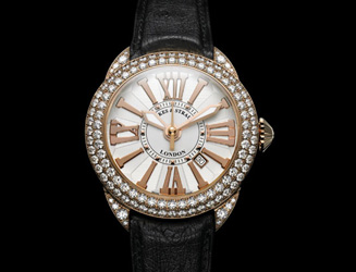やはりロンドンの名所である、ピカデリー・サーカスをモチーフとした時計。写真のモデルはベゼルにダイヤモンドが2連で取り巻かれている。自動巻き、RGケース×ダイヤモンド×レザーストラップ、420万円