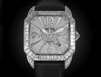 写真はバゲットダイヤモンドをあしらったモデル。アラビアンインデックスとバーインデックスのデザインも個性的だ。ロンドンの公園、バークレー・スクエアがモチーフ。自動巻き、WGケース×ダイヤモンド×レザーストラップ、2100万円