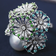 女性の柔らかさや優しさを感じさせてくれる石使いや意匠が特徴だ。ことにオープンワークの軽やかさ、そして可憐なカラーストーンのバランスにこだわったという。