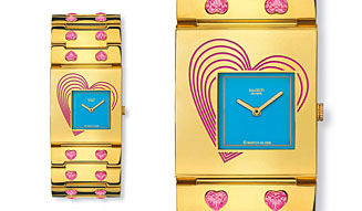 スウォッチとコラボした新作コレクションは、マニッシュの独特な世界観と遊び心あふれた色彩感覚で表現されたデザインに仕上がり、クリスタルやエナメルなど繊細かつインパクトのあるディテールは、アクセサリー感覚でスタイリングを演出する。
