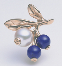 今年のチャリティージュエリーは、花を真珠で、実をラピスラズリで表現したブルーベリーがモチーフのペンダントトップ兼用ピンブローチ。