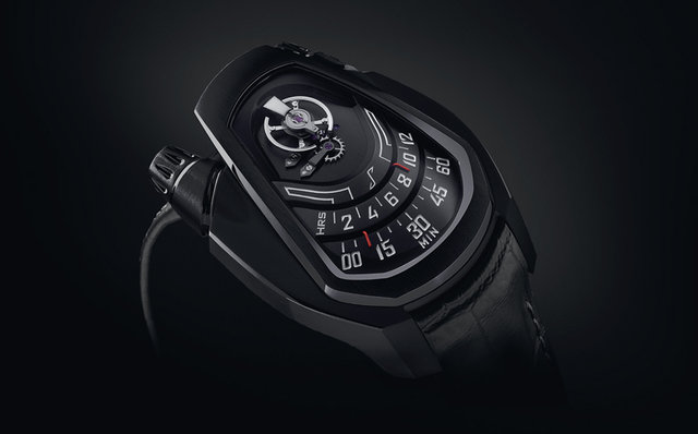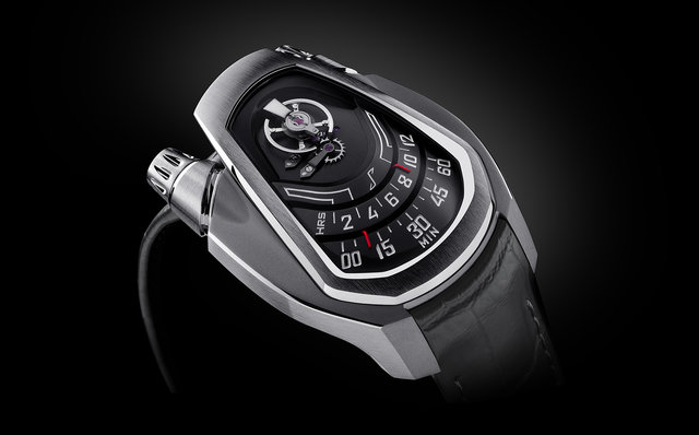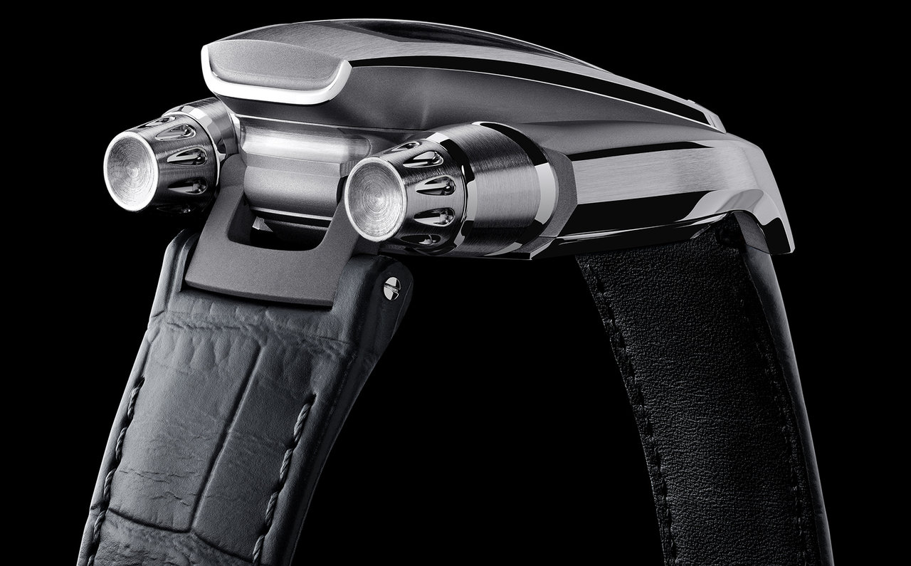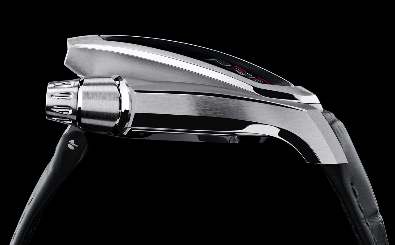 また円形劇場のようなエモーショナルな形には理由があり、時刻表示の最適化、人間工学、新たな時計デザインについて熟考を重ねた結果、辿り着いた形だという。なるほど、機構の複雑さと流れるようなデザインがスーパーカーをイメージさせる。