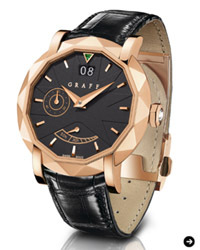 「グラフスター」は、宝石の輝きを思わせるマルチファセットデザインのベゼルや、リングの立爪をイメージしたラグ、そして文字盤の星模様と12時位置に配された豪華なエメラルドなど、グラフウォッチの特徴的なデザインを詰め込んだコレクション。今年は12時位置にグランドデイトを配した新作が登場した。ムーブメントには、グラフのために開発された「グラフキャリバー1」を搭載。9時位置にはスモールセコンド、6時位置には50時間のパワーリザーブ表示を配する。裏面からはグラフウォッチの特徴であるファセットパターンなど、グラフならではのクラフツマンシップを覗のぞくことができる。