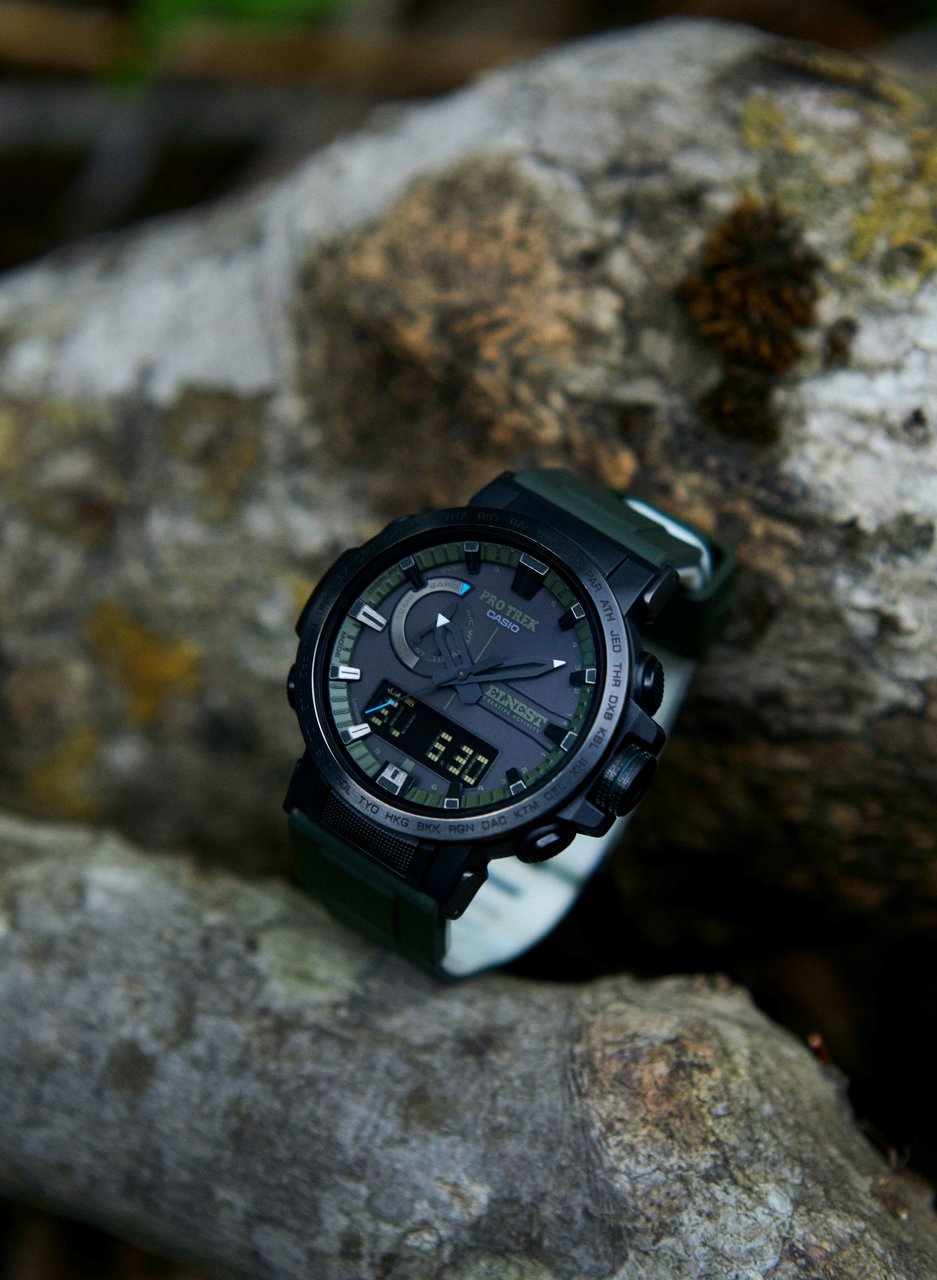 ベースとなるのは、軽量でシンプルなデザインの「PRW-60」。自然の静寂をイメージしたブラックアウトダイアルは必要最低限の情報をストイックに伝えるミニマムなデザインが特徴だ。デュラソフトバンドと針が指し示すインデックスリングには森林をイメージした「フォレストグリーン」を採用。ブラックで引き締まった文字盤をモダンな印象で引き立てる。