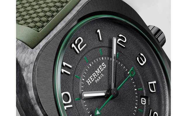 「エルメス H08」のクッション形ケースは、複合素材のブロックから作り上げられたものだ。この軽量かつ堅牢、オリジナルな新素材は、繊維を編んでアルミ加工を施したグラスファイバー、熱硬化性エポキシ樹脂、スレートパウダーからなる。天然色素が光を反射して微妙なシルバーの光を放ち、組み合わされたサンレイサテン仕上げのブラックセラミック製ベゼルとリュウズが存在感を引き締めている。光と影の戯れが、グレイン仕上げを施した深みのあるセメント色の文字盤の深みを際立たせ、夜光塗料を施した黒い針とインデックスが絶妙なアクセントを添えている。