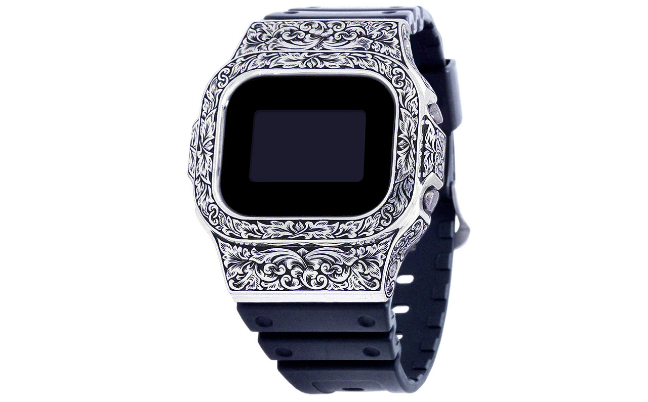 G-SHOCKのカスタムパーツを展開する「DAMUE(ダミュー)」が、妖刀村正から着想を得たという「MURAMASA」シリーズは、シルバー素材のベゼル全面に彫金(タガネによる彫り模様)を施したカスタムG-SHOCK。定番のG-SHOCK 5600シリーズをベースとした「MURAMASA 5600」、BABY-Gをベースとした「MURAMASA 5000」の2サイズを展開する。