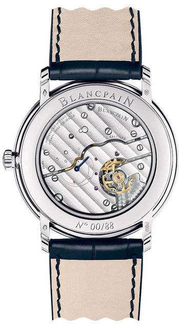 優美なブルーのダイアルに、ブルーのアリゲーターレザーストラップを組み合わせた本作は、世界限定88本でブランパン ブティックのみで取り扱われる。