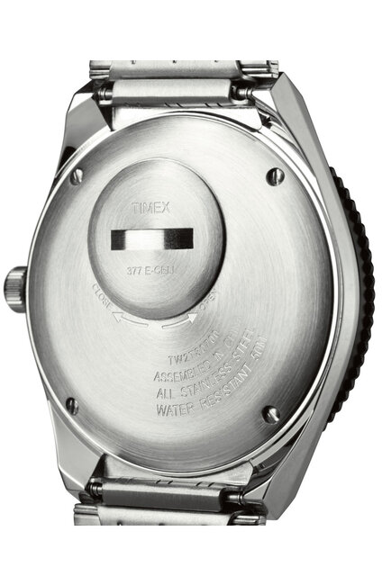 オリジナルの赤と青に塗り分けられたアルマイト加工の回転式ベゼル、コインを使ってユーザー自身で電池を交換できるハッチ・ケースバック構造、腕馴染みがいい巻きタイプのSSブレスレット、そして当時の先端技術であったクオーツムーブメントの頭文字“Q”を文字盤のブランドロゴの上に配したディテールがそのまま再現されている。