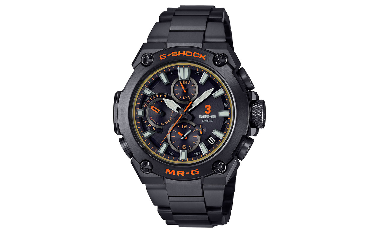 ベースモデルにはミッドサイズ化した「MRG-B1000」を採用。耐衝撃構造とBluetooth®搭載電波ソーラーを備え、世界中のあらゆる場所で正確な時刻表示が可能だ。また、新開発の「クラッドガード構造」により、リュウズの操作性と耐衝撃性の両立を成功させるとともに、ダウンサイジングを実現。MR-Gらしい存在感はそのままに、腕になじむサイズ感へと仕上げられた。