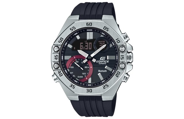 八角形のベゼルが特徴的な「ECB-10」は、レーシングチームへのヒアリングをもとに開発され、新たに常時接続のスマートフォンリンク機能を搭載したモデルだ。そして分刻みの予定をこなすチームの時間管理に役立つスケジュールタイマーや、世界各地を転戦する際に役立つ自動タイムゾーン補正などの機能を搭載する。